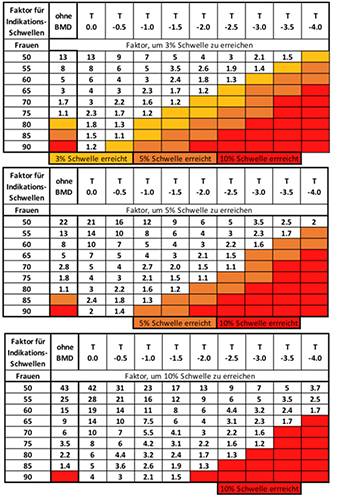 Die Grafiken veranschaulichen die Therapieinterventionsschwelle abhängig vom Lebensalter, Risikofaktoren und Knochenmineralgehalt an der Gesamthüfte. Dabei bedeutet gelb, dass das 3-Jahresfrakturrisiko 3-5% beträgt, orange stellt ein 5-10%iges Risiko dar und rot ein Frakturrisiko > 10%. Die Zahlen veranschaulichen wie hoch der Risikogradient sein muss, um die entsprechende Schwelle zu erreichen. Für mehr Informationen empfehle ich die DVO Leitlinie von 2023.