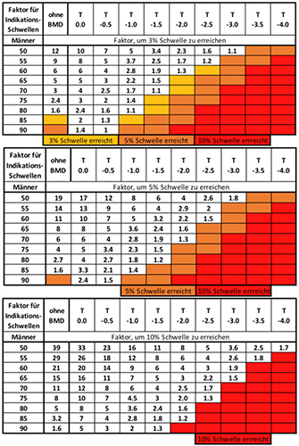 Die Grafiken veranschaulichen die Therapieinterventionsschwelle abhängig vom Lebensalter, Risikofaktoren und Knochenmineralgehalt an der Gesamthüfte. Dabei bedeutet gelb, dass das 3-Jahresfrakturrisiko 3-5% beträgt, orange stellt ein 5-10%iges Risiko dar und rot ein Frakturrisiko > 10%. Die Zahlen veranschaulichen wie hoch der Risikogradient sein muss, um die entsprechende Schwelle zu erreichen. Für mehr Informationen empfehle ich die DVO Leitlinie von 2023.